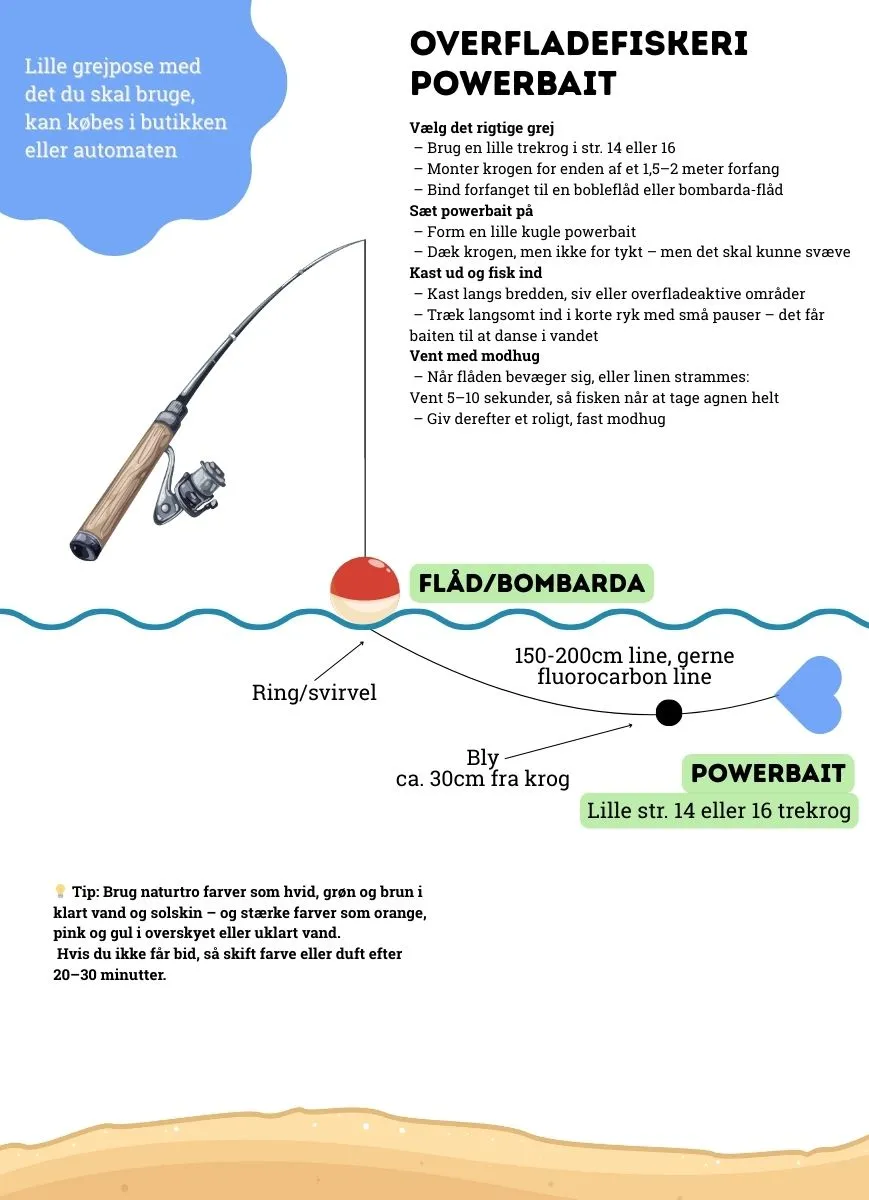 Husk Powerbait skal fiskes med små trekroge str. 14 eller str. 16